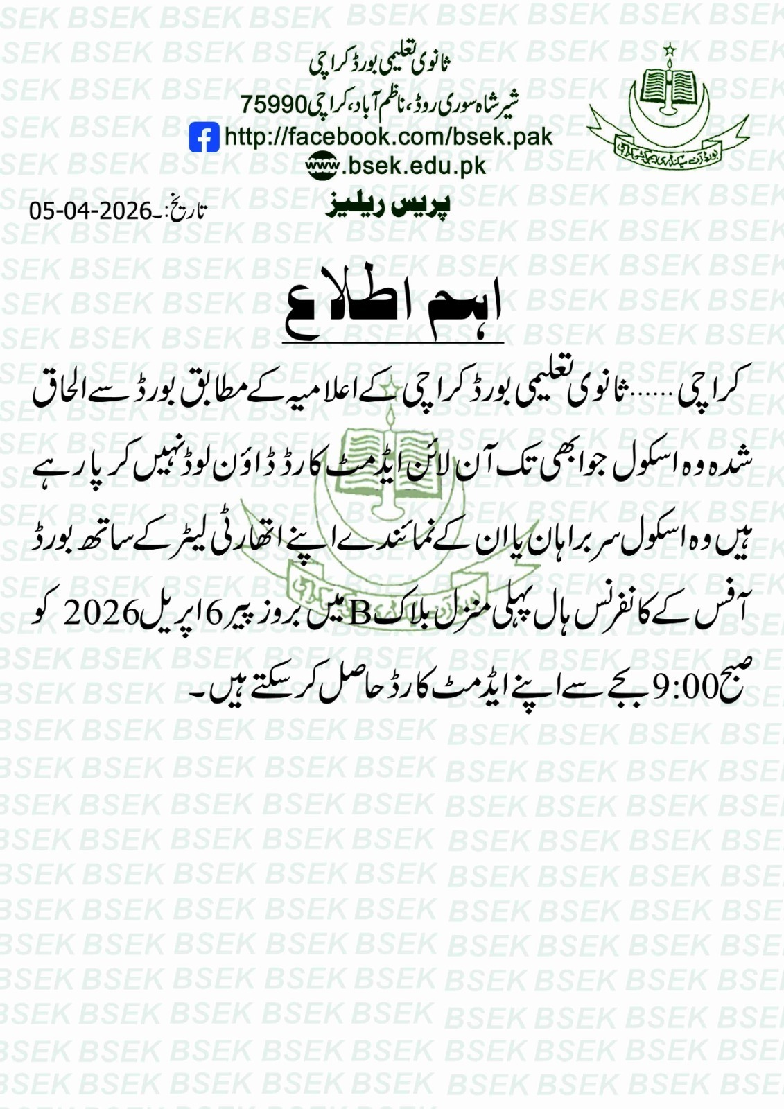 Earlier, the Karachi Matriculation Board announced that schools can obtain their students’ admit cards from the board on Monday, April 6, by presenting an official authority letter.