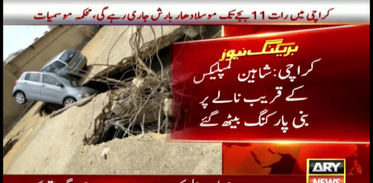 KARACHI: A giant hole in the earth has gobbled up several vehicles parked on the road constructed on a nullah near Shaheen Complex building which caved in during the ongoing heavy rainfall in Karachi, ARY NEWS reported on Thursday.