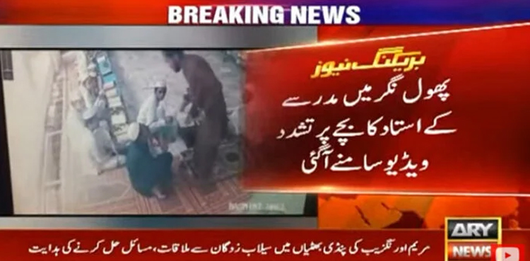 KASUR: A corporal punishment incident has gone viral on social media, which occurred in Phool Nagar, Kasur, where a madrassa teacher was caught beating a young student brutally with a stick for eating chickpeas, ARY News reported.