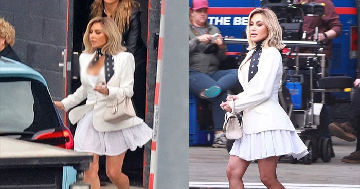 Kardashian paired the bold new ‘do with an all-white ensemble, wearing a low-cut mini dress with a pleated skirt and a tailored blazer that accentuated her waist. She completed the look with a black polka-dot scarf tied at the neck and pointed heels, blending classic glamour with her signature edge.