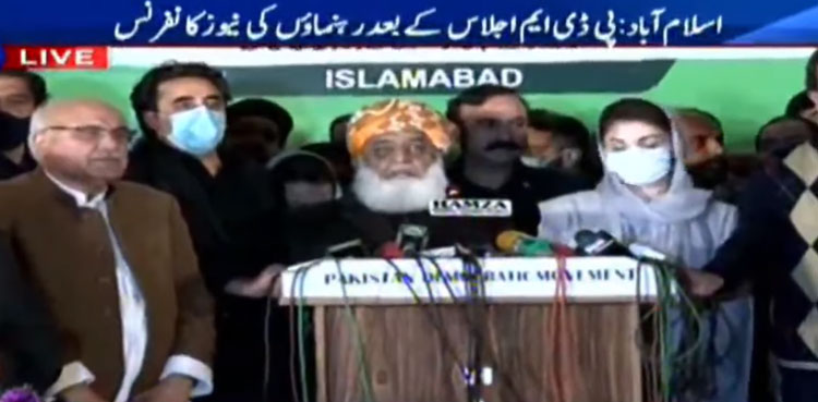 “Opposition lawmakers from national and provincial assemblies will submit resignations to their respective party heads by December 31,” said Fazl while addressing a press conference along with Pakistan Peoples Party (PPP) Chairman Bilawal Bhutto Zardari and Pakistan Muslim League-Nawaz (PML-N) Vice President Maryam Nawaz.