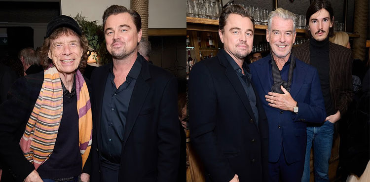 Leonardo DiCaprio poses with Mick Jagger, Pierce Brosnan at 'One Battle After Another' bash