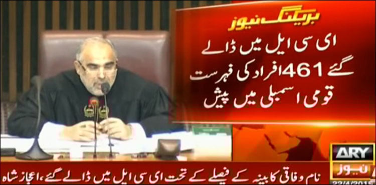 ISLAMABAD: A list of 461 people who have been placed on the Exit Control List (ECL) was presented before the National Assembly on Monday, ARY News reported.