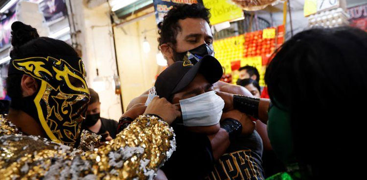 Mexico’s famous lucha libre wrestlers turned Latin America’s largest wholesale food market into a battleground against COVID-19 this week, barging down walkways to urge people to wear masks to contain the virus.