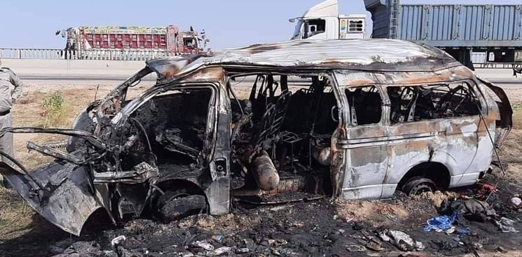 The ill-fated passenger van, carrying 22 passengers, was coming to Karachi from Hyderabad when it overturned near the cerement factory at the motorway and caught the fire.