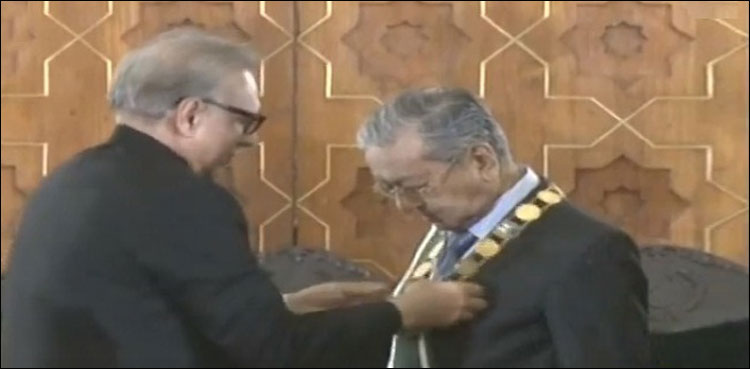 ISLAMABAD: President of Pakistan, Dr Arif Alvi, on Friday conferred the country’s highest civilian award ‘Nishan-e-Pakistan’ on Malaysian Prime Minister Mahathir Mohamad during a ceremony at the President House, ARY News reported.
