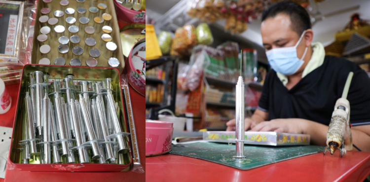 This year, a box set of a syringe and two vaccine vials made of paper are among the fastest-selling items for the festival at Raymond Shieh Siow Leong’s religious goods store in the southern Malaysian city of Johor Bahru.