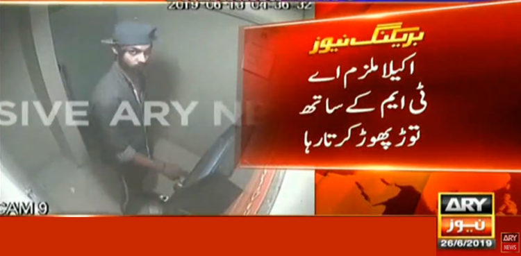 The CCTV footage, which was obtained by ARY News, showed that the young man was apparently fearless of being recorded by the security camera which can lead to strict action against him over breaking the bank’s asset and robbing cash.