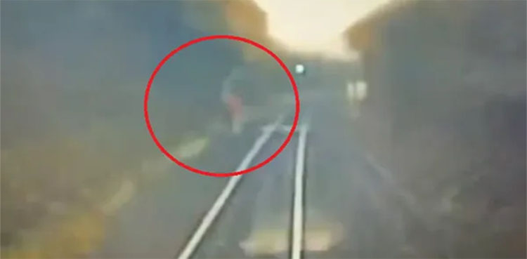 In what appeared to be a miraculous escape from a train hit, a jogger wearing headphones missed a tragedy by nearly some metres after he crossed the rail line remaining clueless about a fast-approaching locomotive.