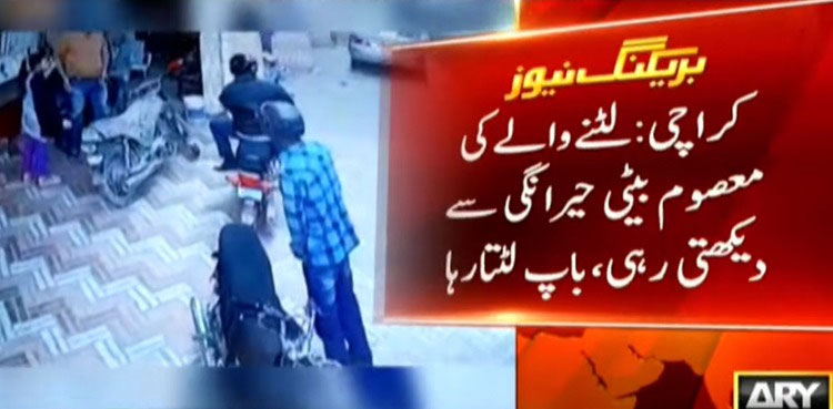 In a CCTV footage, obtained by ARY News, three dacoits on two motorcycles can be seen looting a man on gunpoint outside his home in front of his minor daughter who was shockingly witnessing the crime scene.