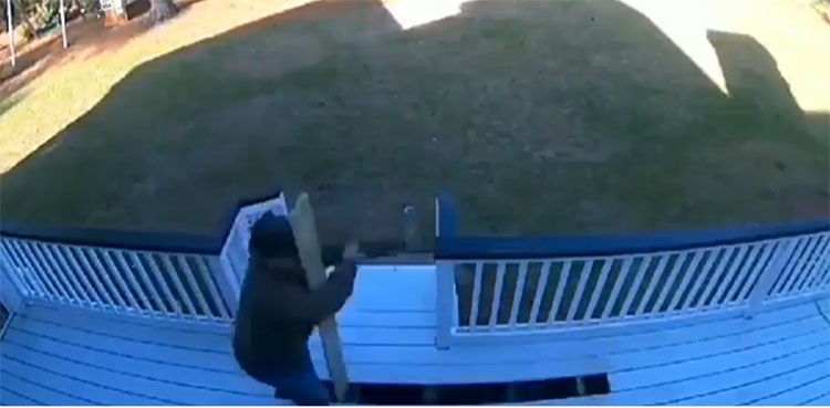 The video shows a man carrying a wooden plank to fix the deck of his house. He then puts it down and tries to adjust the gap using his foot to secure the plank.