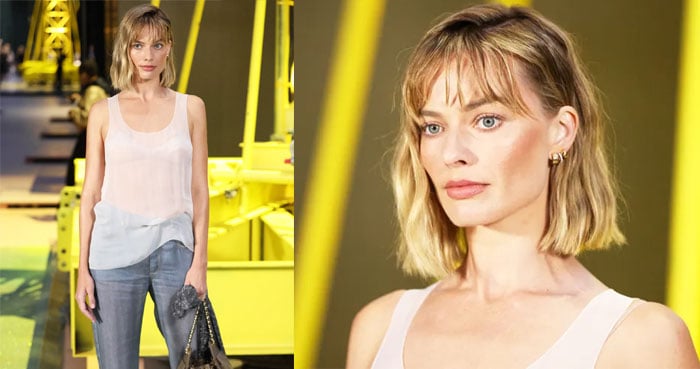 Robbie paired the fresh look with a simple yet chic outfit. She wore a sheer white scoop-neck tank layered over a coordinating bralette, styled with loose, baggy denim trousers that draped over her shoes. Two-toned tan and black heels completed the ensemble.
