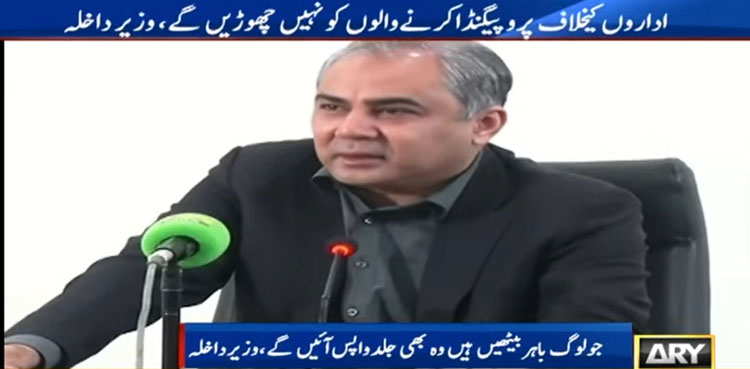 Interior Minister Mohsin Naqvi has warned that those spreading propaganda against state institutions will face strict action, adding that Pakistanis currently residing abroad will soon be called back and held accountable if involved in any unlawful activities, ARY News reported.
