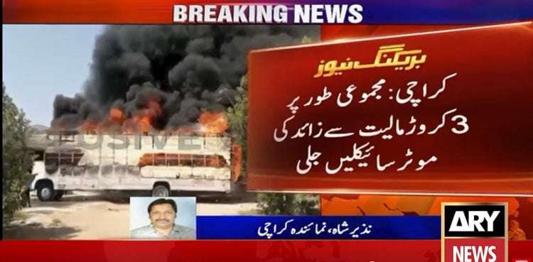 ARY News obtained footage showing a delivery truck carrying the motorcycles engulfed in flames. Motorcycles worth Rs30 mln were reduced to ashes in the fire