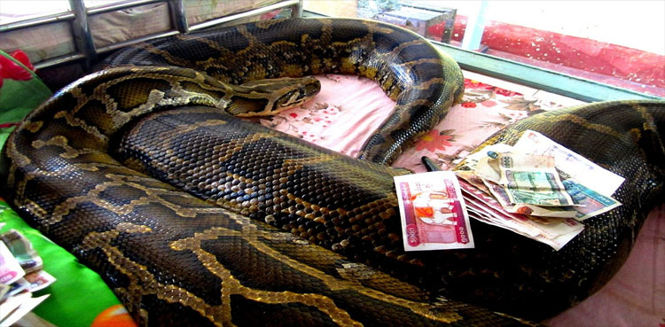 Many locals regard the presence of the dozens of pythons, some measuring up to two or three metres in length, as a sign of the pagoda’s power.