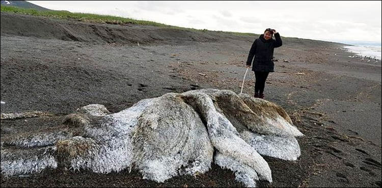 Locals have speculated that it’s a bizarre primeval relic from the deep or an extinct woolly mammoth released from an undersea permafrost grave by the warm summer. However, a marine scientist says it could be part of a whale.