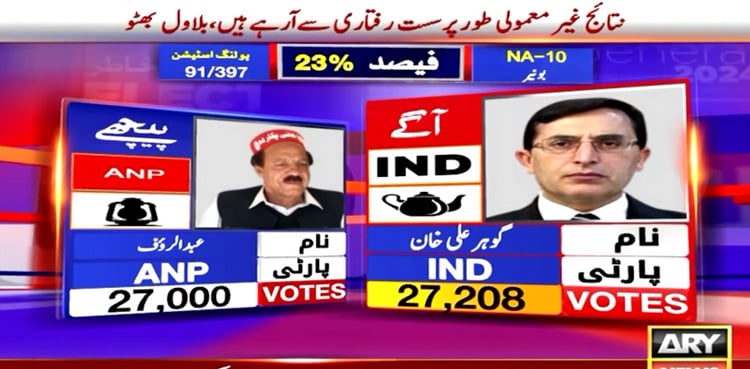 The latest unofficial result of NA-10 Buner revealed that the Pakistan Tehreek-e-Insaf (PTI) backed independent candidate Gohar Ali Khan secured a lead with 27,208 votes against the Awami National Party (ANP) candidate in the general election 2024, ARY News reported.