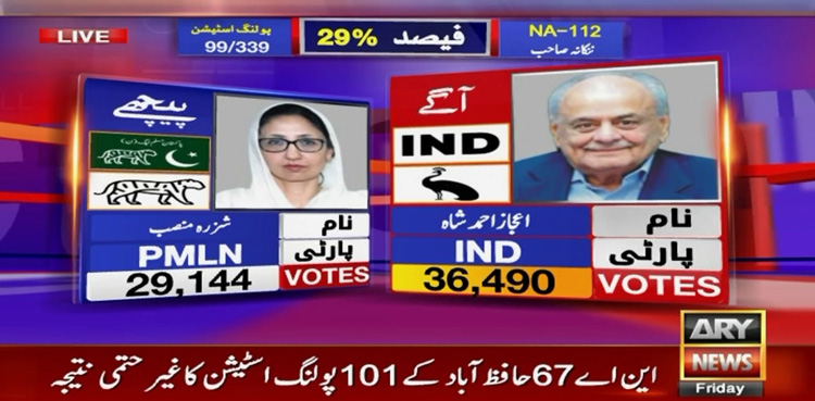 The unofficial result from 99 polling stations of NA-112 Nankana Sahib revealed that the Pakistan Tehreek-e-Insaf (PTI) backed independent candidate Aijaz Ahmed Shah secured a lead with 36,490 votes against Pakistan Muslim League Nawaz (PML-N) candidate Shezra Mansab in the general election 2024, ARY News reported.