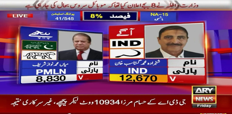 The PTI-backed independent candidate Gustasap Khan has a lead of 3,840 votes against PML-N candidate Nawaz Sharif, who managed to get 8,830 votes.
