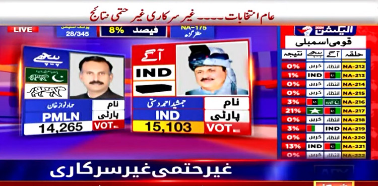 According to unofficial results received from all 345 polling stations of NA-175, the PTI-backed independent candidate Jamshed Dasti won the seat of NA-175 by securing 113,253 votes having a lead of 41,256 votes over Pakistan Peoples’ Party (PPP) candidate Mehar Arshad, who came in second position with 71,997 votes.