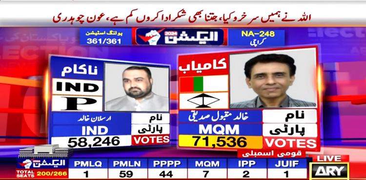 The Muttahida Qaumi Movement – Pakistan (MQM-P) secured another seat in Karachi’s National Assembly constituency (NA-248) in the general election 2024, ARY News reported.