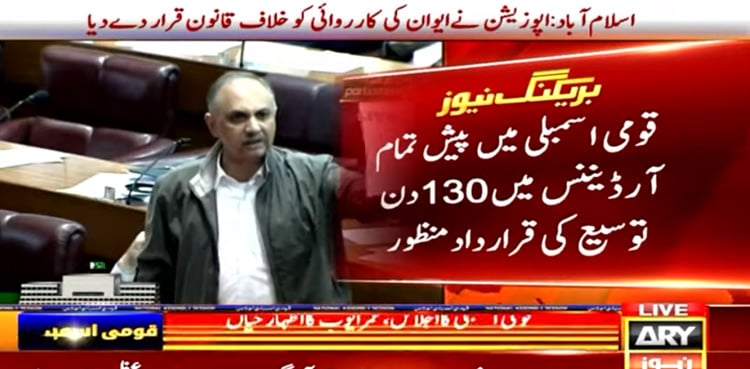Omar Ayub terming the session ‘against the law’ condemned the government’s move of presenting seven ordinances. He said they have not seen the ordinances presented in the house, why the government is in a hurry?