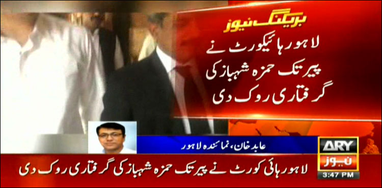 The high court on a petition stopped the NAB from arrest of Hamza Shehbaz till Monday when the court will hear his protective bail.