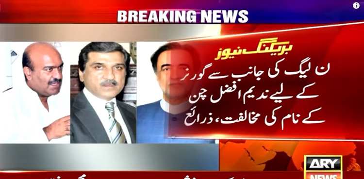 LAHORE: Pakistan Muslim League-Nawaz (PML-N) has opposed PPP’s Nadeem Afzal Chan as Punjab governor, ARY News reported, citing sources.