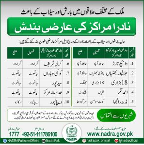 NADRA further informed that citizens from the affected areas may visit nearby operational centers for their service needs.