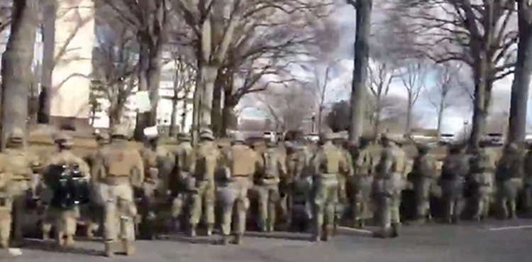 The article features an embedded video, which is no longer available, of National Guard soldiers lining a road. The video is shot from a moving vehicle, purportedly part of Biden’s motorcade during the January 20, 2021 inauguration. Dozens of soldiers can be seen looking away from the convoy.