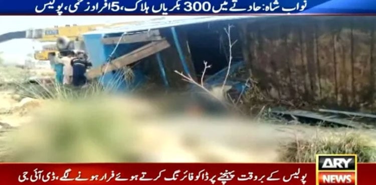 NAWABSHAH: At least 300 goats were killed and five people injured after a livestock-laden trailer overturned near the Qazi Ahmed toll plaza in Nawabshah district.