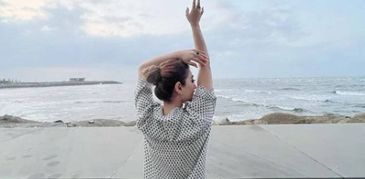 The viral snaps see Nawal Saeed posing in front of the sea and the picturesque blue sky. The celebrity kept the look super casual with a top knot and wore a pair of blue denim and a black-white printed top, for what looked like a day out.