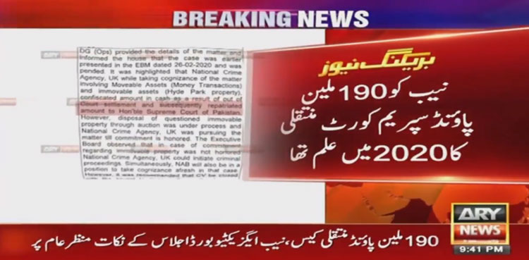 ISLAMABAD: The minutes of meeting of the NAB executive board revealed that the watchdog was aware of £190m transfer by the Britain’s National Crime Agency (NCA) and decided to close the case in 2020, ARY News reported on Wednesday.
