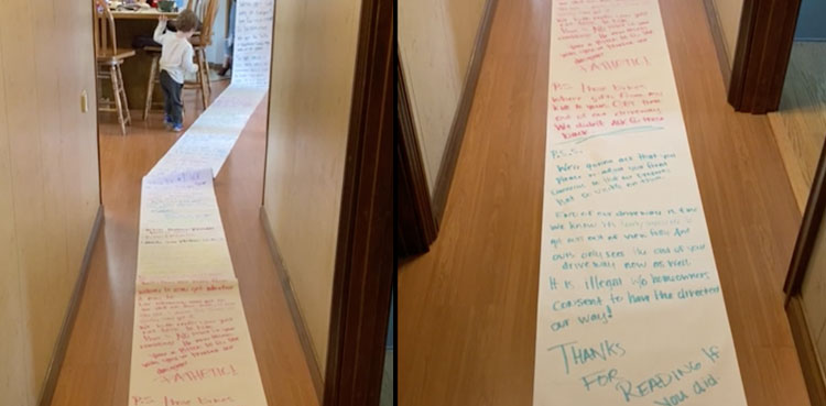 A parent got a strange 15-metre long note from a neighbour following a toy dispute.