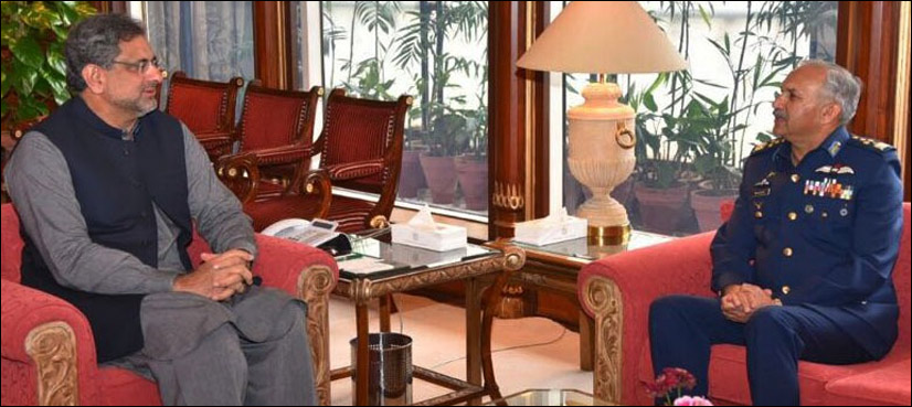 Professional matters pertaining to PAF came under discussion in the meeting with Prime Minister Shahid Khaqan Abbasi at Prime Minister’s Office. The premier congratulated Air Chief Marshal Mujahid Anwar Khan on assuming his new responsibilities and expressed the hope that PAF would greatly benefit from his professional capabilities and leadership.