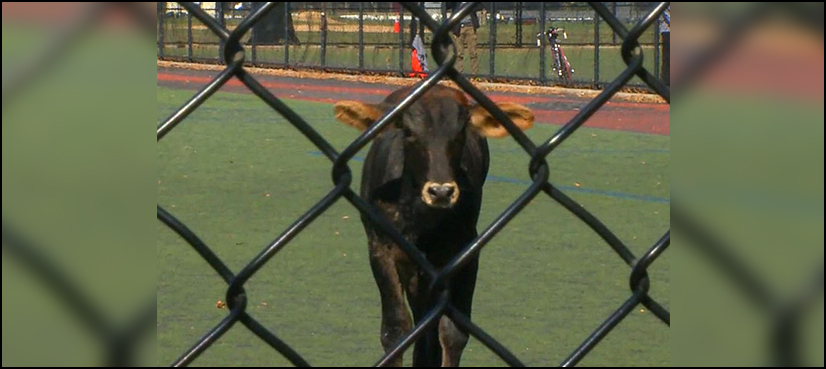 Police eventually trapped the cow between two vehicles parked on either side of baseball field’s bench area after an officer appeared to fire a tranquilizer dart at it.