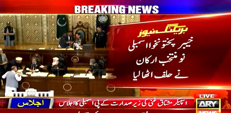 PESHAWAR: The newly elected members of the Khyber Pakhtunkhwa Assembly took their oaths of membership on Wednesday amid ruckus caused by Pakistan Tehreek-e-Insaf (PTI) workers in the legislature, ARY News reported.