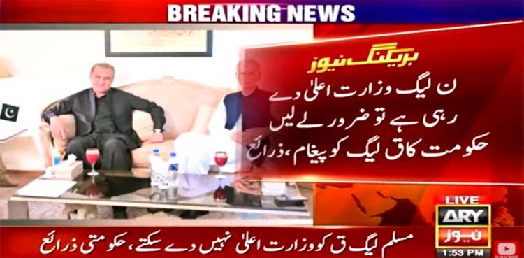 LAHORE: The federal government has conveyed to its key ally in Centre and Punjab, Pakistan Muslim League-Quaid (PML-Q) that it could not give slot of chief minister Punjab to the party in return of supporting a no-trust move against Prime Minister Imran Khan, ARY NEWS reported.