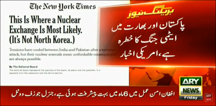 WASHINGTON: The New York Times on Thursday claimed that a threat of nuclear war between Pakistan and India still remains.