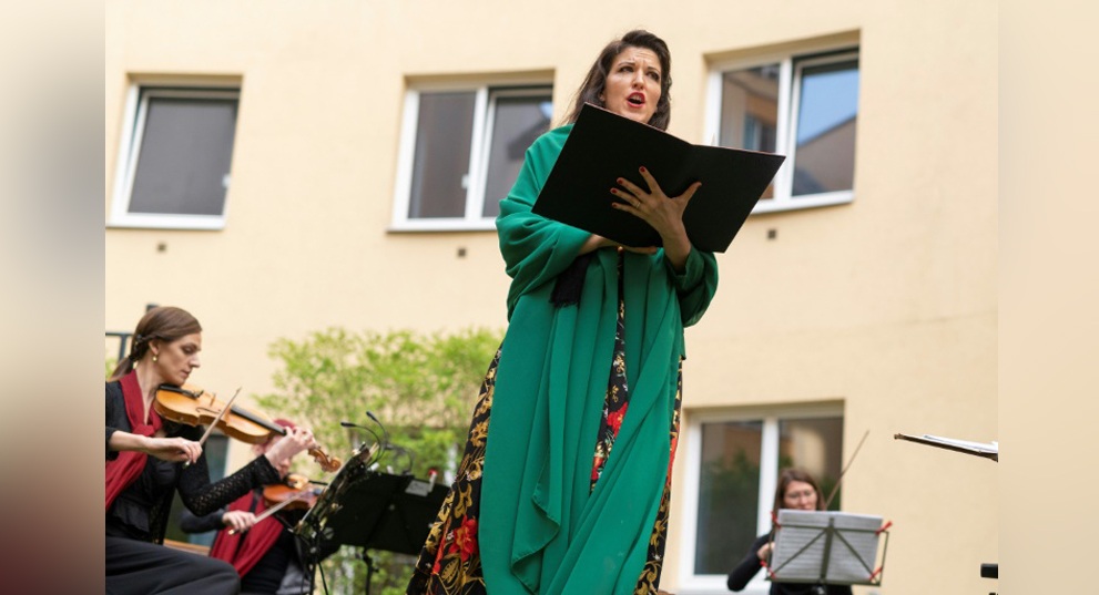 The guest bedrooms, which have stood empty during the coronavirus lockdown, were transformed into opera boxes for an evening, and the hotel courtyard into a stage to create a rare moment of joy in the city of music on Saturday.