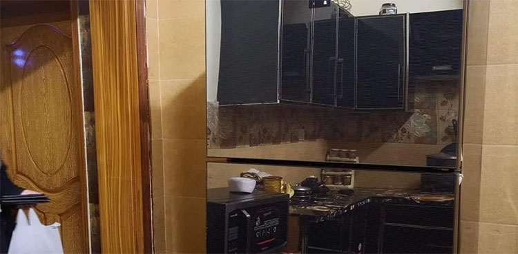 There’s a wooden door and there are metallic cupboards, microwave oven and other kitchen items, however, the fridge could not be spotted in the picture.