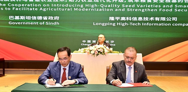 The second MoU, focusing on agricultural technology cooperation, was signed between the Sindh government and Longping High-Tech Information Company. Sharjeel Inam Memon signed for Pakistan, while Chen Zhixin, Chairman of Longping High-Tech Information Company, represented China.