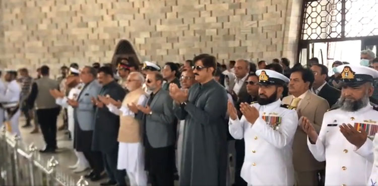 Governor Imran Ismail and Chief Minister Murad Ali Shah arrived at the mausoleum of Quaid-e-Azam Muhammad Ali Jinnah to pay respects. They laid floral wreaths and offered Fateha.
