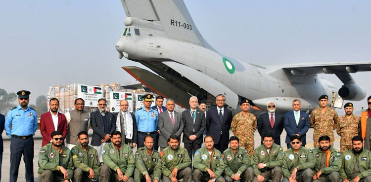 Caretaker Foreign Minister Jalil Abbas Jilani, Palestinian Ambassador to Pakistan Ahmed Jawad Rabi’i, officials of NDMA and Armed Forces were also present at the airbase.