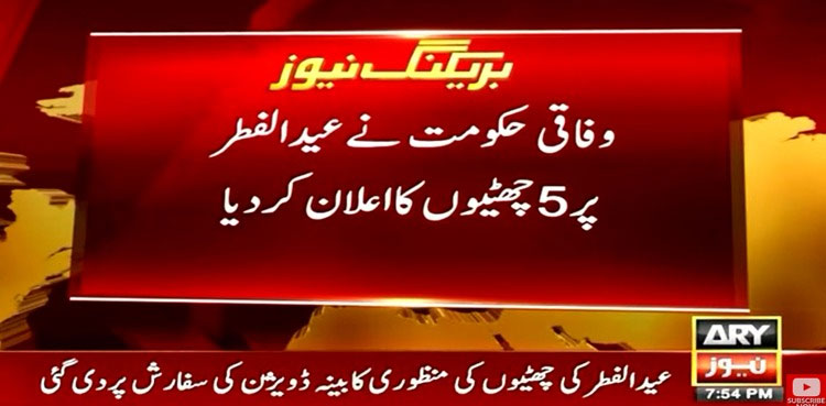 ISLAMABAD: The federal government on Thursday announced a five-day-long holiday for Eidul Fitr in Pakistan, ARY News reported.