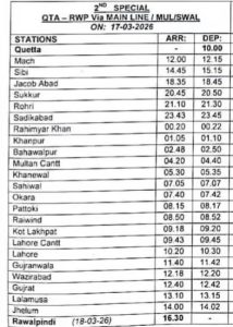 The second service will operate from Quetta to Rawalpindi on March 17, with scheduled stops at Sukkur, Rahim Yar Khan, Khanewal, and Lahore.