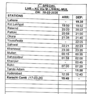 The first train will depart from Lahore at 7:30 pm on March 16 and arrive in Karachi at 3:45 pm on March 17, making stops in Okara, Sahiwal, and Khanewal.
