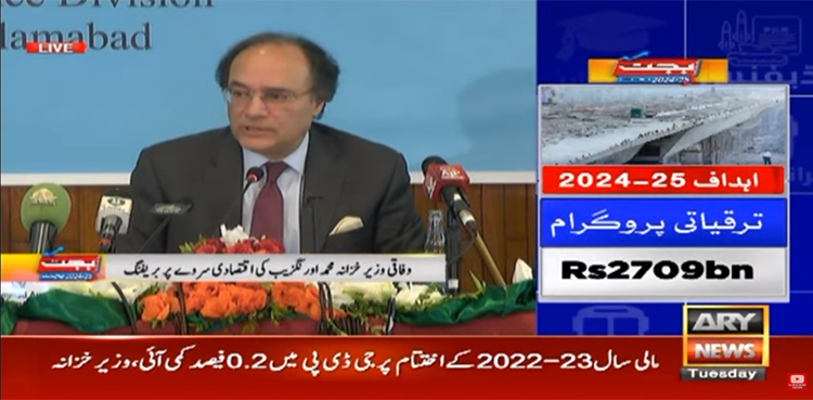 ISLAMABAD: Pakistan recorded a gross domestic product (GDP) growth of 2.38 percent, up from the envisaged target of 2pc as Finance Minister Muhammad Aurangzeb unveiled the Economic Survey of Pakistan 2023-24, ARY News reported on Tuesday.