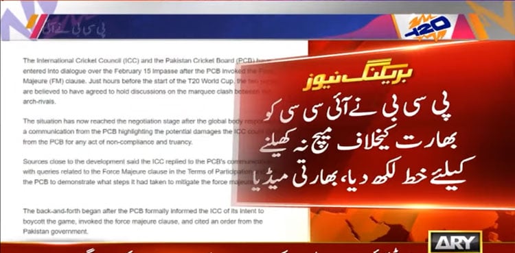 ISLAMABAD: The Pakistan Cricket Board (PCB) has written to the International Cricket Council (ICC) regarding its refusal to play against India in the scheduled February 15 league match of the ongoing ICC T20 World Cup, according to claims by Indian website Cricbuzz, reported by ARY News.