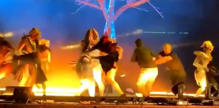 The assailant was arrested after state television footage showed him stomping onto the stage in Riyadh’s King Abdullah Park during a musical performance by what appeared to be a foreign theatre troupe.